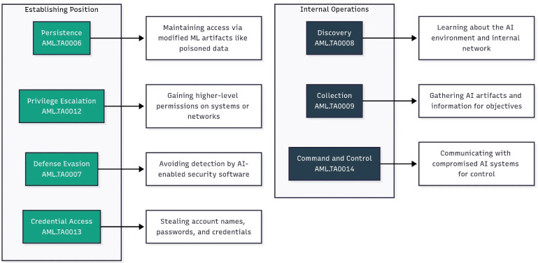 Establishing Position ensures persistent and undetected presence by maintaining access through modified ML artifacts like poisoned data, escalating privileges within AI systems or networks, evading AI-enabled security software, and stealing authentication credentials including API keys and model access tokens. Internal Operations focuses on exploring the AI infrastructure by mapping the environment and discovering available assets, gathering AI artifacts and sensitive information needed for attack objectives, and establishing covert communication channels with compromised AI systems for ongoing control and command execution.